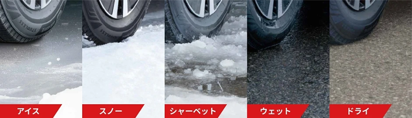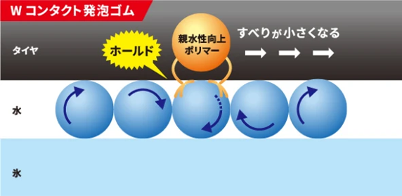 ゴムがやわらかいため氷にしっかり密着。さらに、細かい気泡が路面とタイヤの間にある水膜を除去。