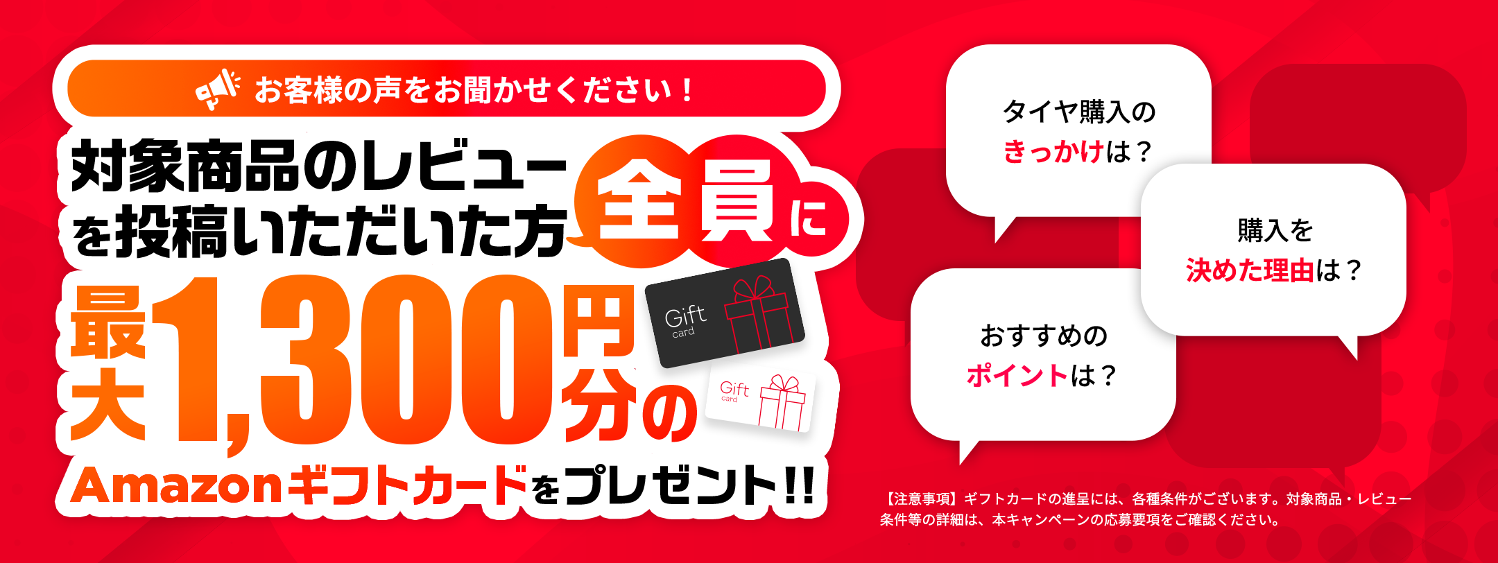 この度ブリヂストン タイヤオンラインストアでは、商品・店舗レビューをご投稿いただくと、最大1,300円分のAmazonギフトカードが必ずもらえるキャンペーンを開催いたします。