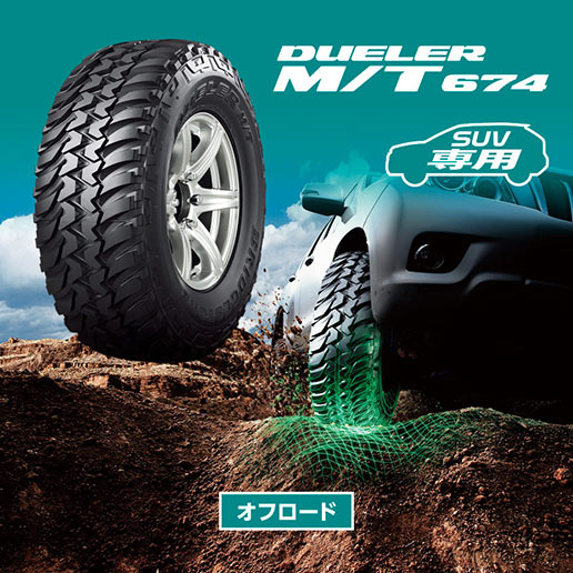 • SUV専用タイヤは、そのタイヤサイズが主に使用される車種で区分しています。従って、車種別専用設計タイヤのサイズが使用車両の新車装着サイズやオプションサイズ、あるいはサイズ対応が認められているサイズであれば専用車種以外の車でご使用いただいても問題ありません。